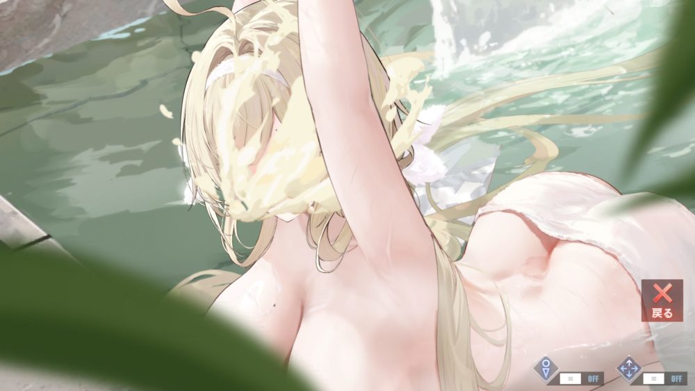 画面上の注がれているお湯をタッチするとお尻にお湯を浴びて揺れている状態になります。この状態でも犬耳等のギミックは可能。