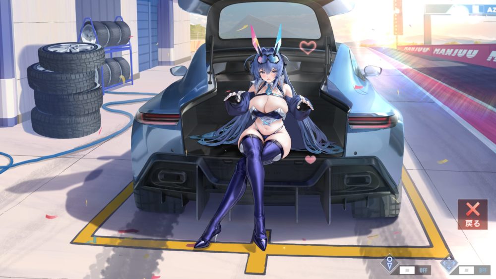 画面左上の詰まれているタイヤをタッチすると、ゴーグルをかけ両手を上げているニュージャージーのアップなります。ニュージャージーが隠れた後車のトランクが閉まり空が映った後にはなんと!