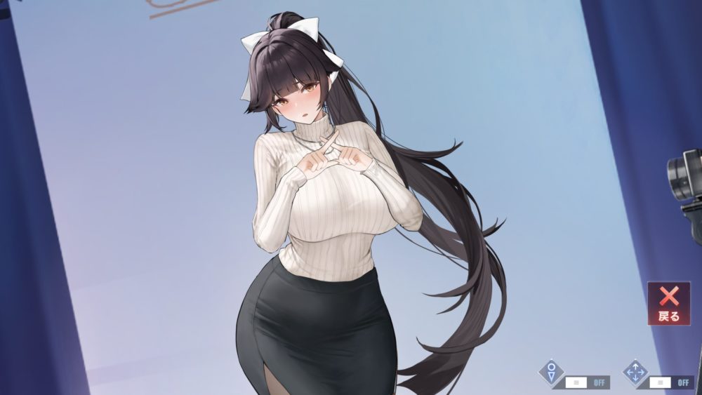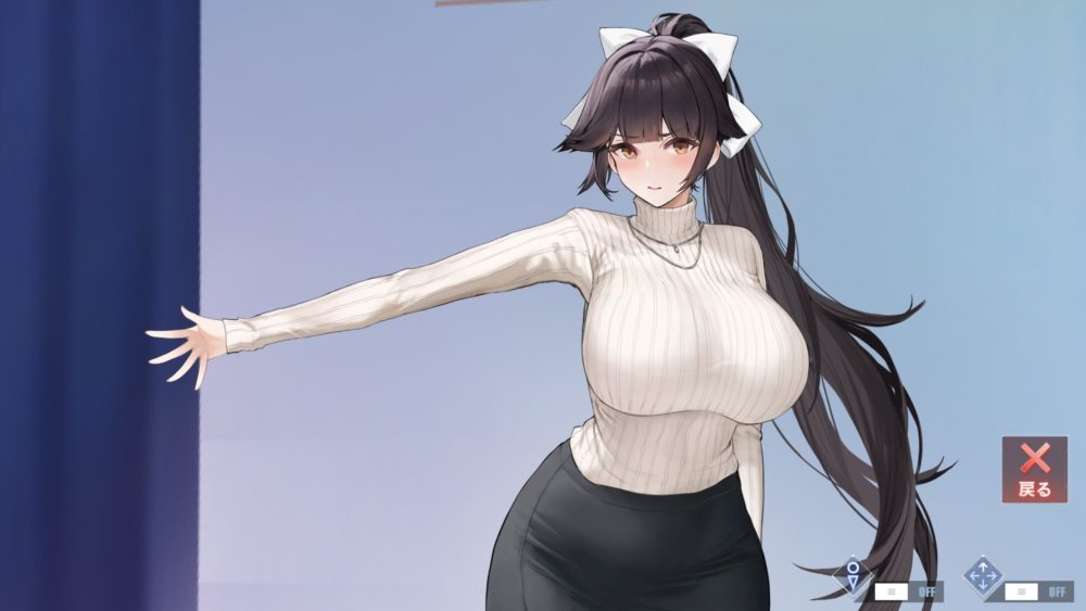 好みの下着に変えられるのが良いですね。セーター捲り上げてタイトスカート脱がしの三角ビキニみたいな下着の組み合わせが好みです。