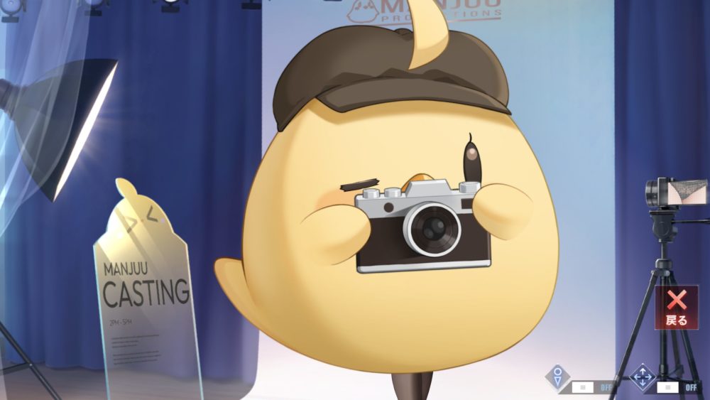 画面左下のアクリル板をタッチすると高雄が写った5種類の写真とスクロールバーが現れ、写真をタッチするとカメラを構えた饅頭がシャッター切り、その写真と同じポーズをとった高雄が見れます。