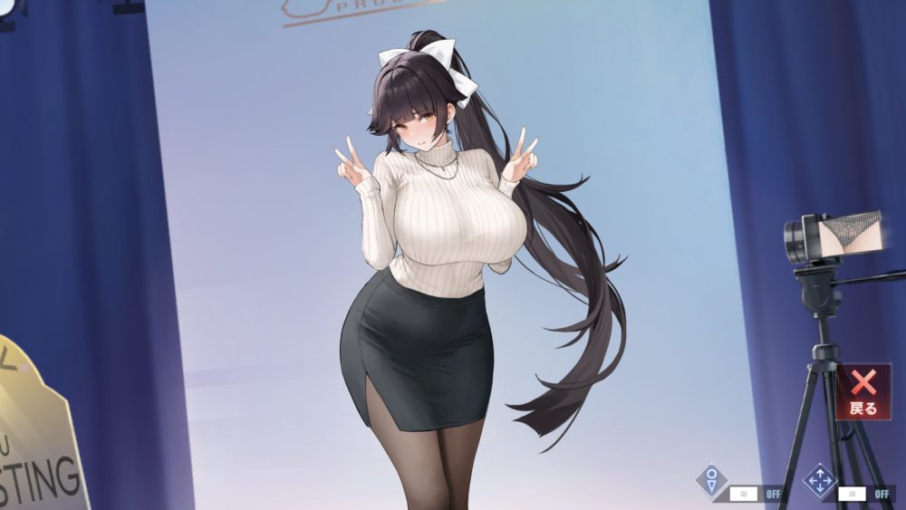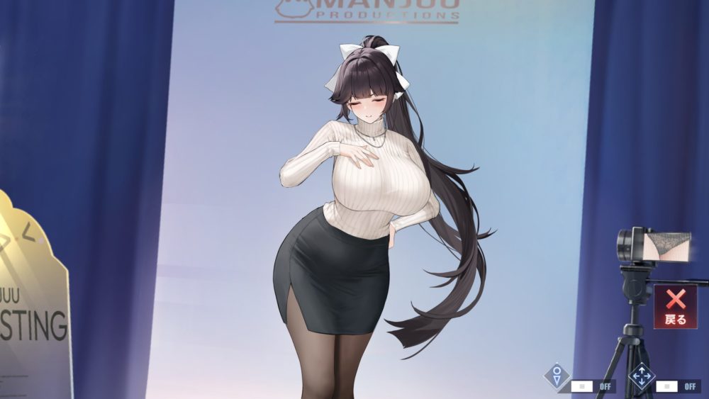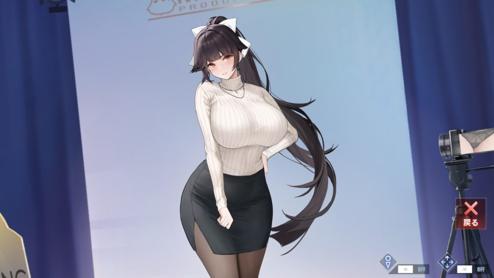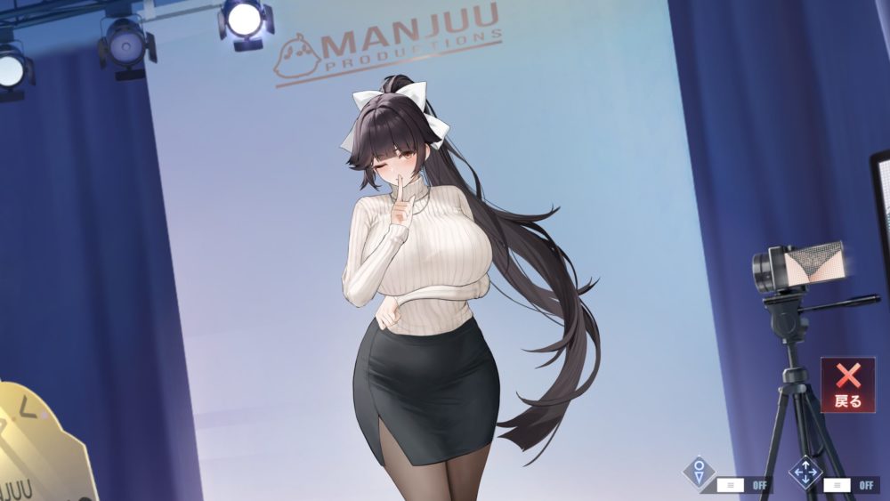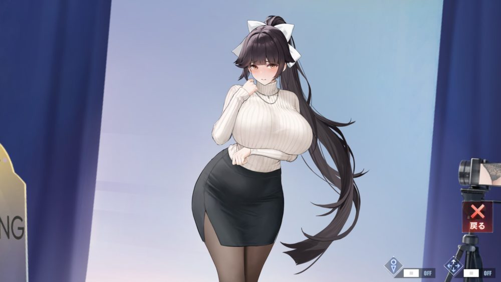 画面右側にあるモニター(ビデオカメラのモニターでも可)のギミックなのですが、セーター捲り上げてタイトスカートを脱がすと画面が変わります。この画面の表示でタッチすることでギミックが発動できます。