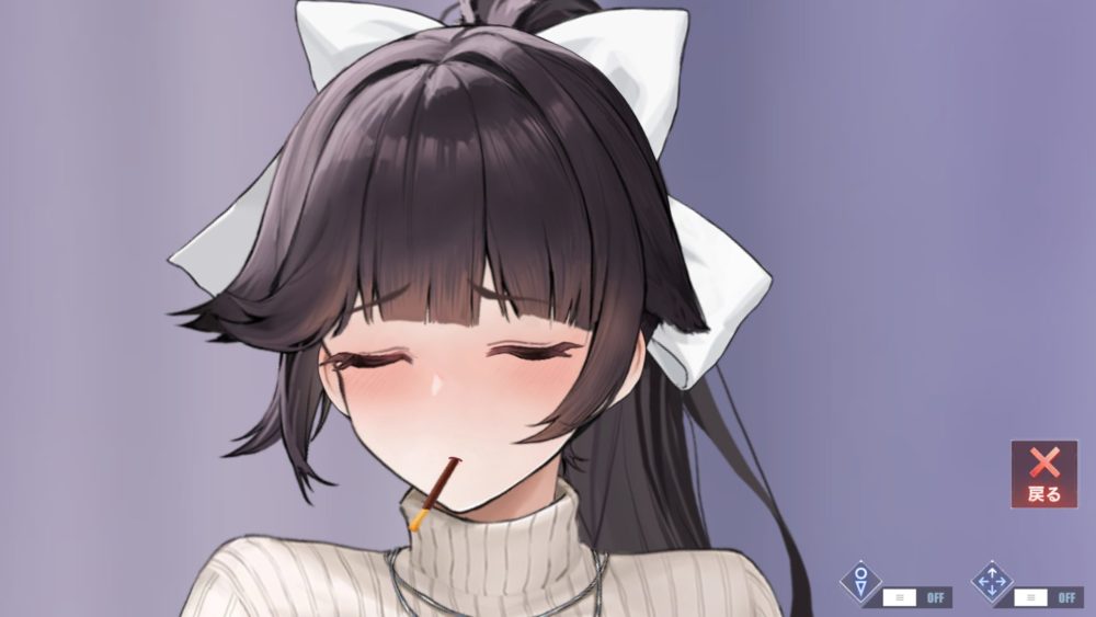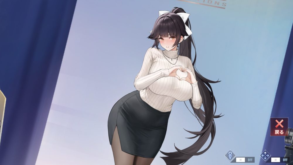 6回目のタッチで高雄がウインクして幕が閉じ、脚を上げて左腕で抱えるポーズに戻ります。画面右上タッチでポーズ(座り)の最初に戻ります。