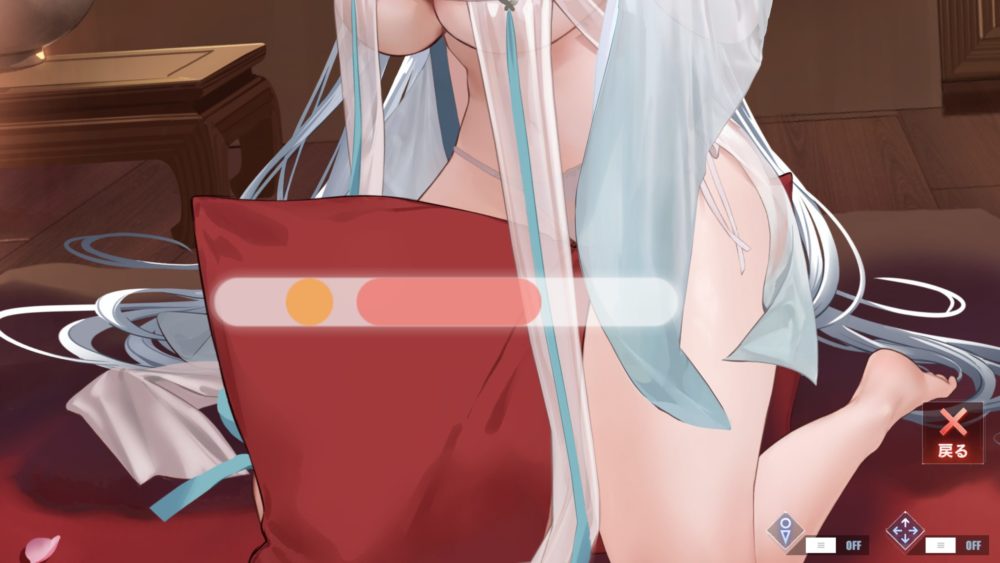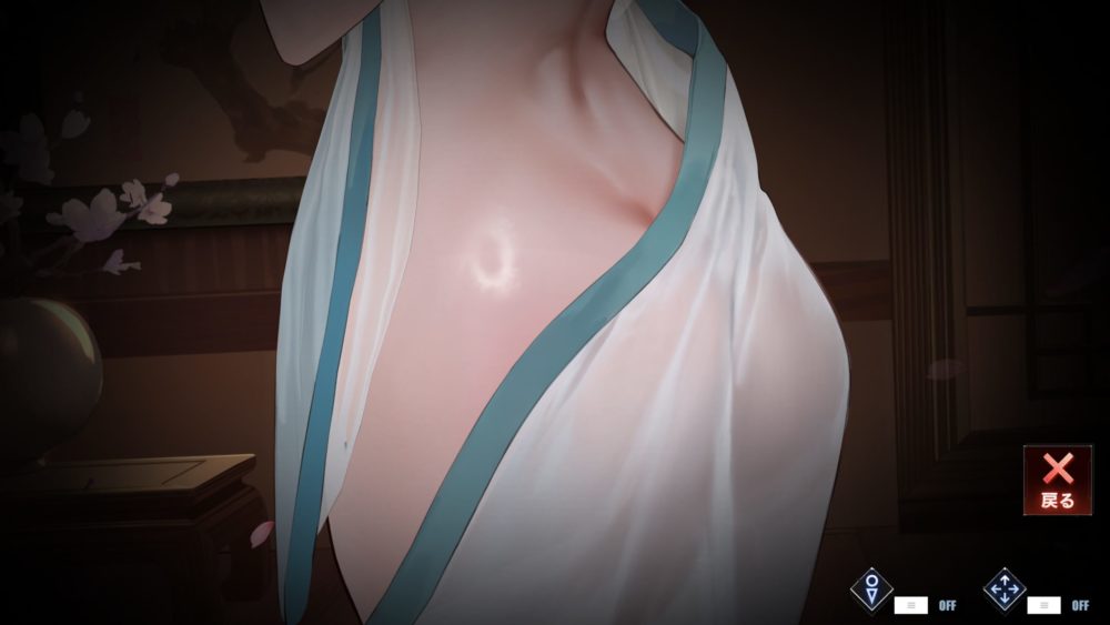 彰武の衣装の襟部分をタッチして下にスライドで下げる事ができます。揉みさすりどちらの時でもOK。