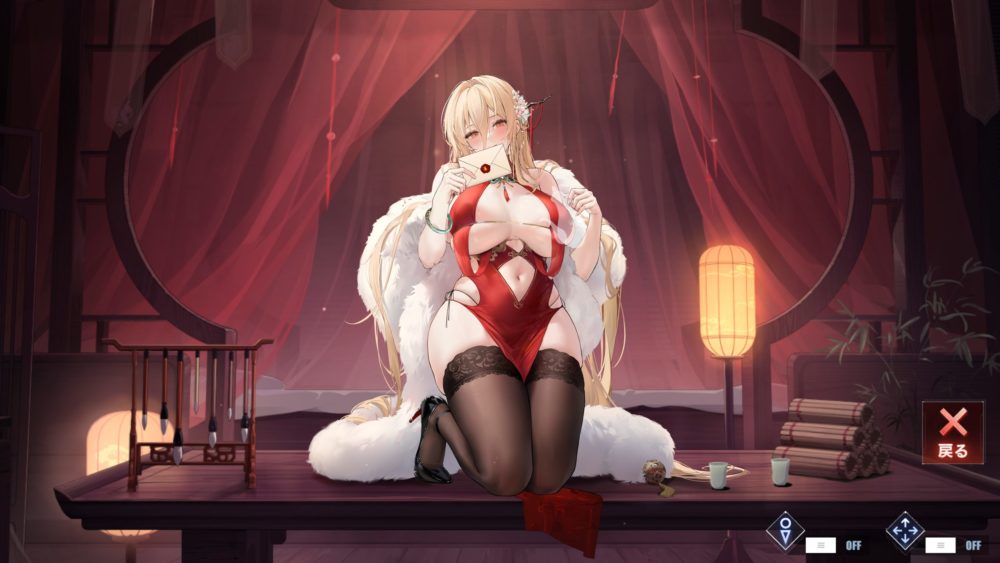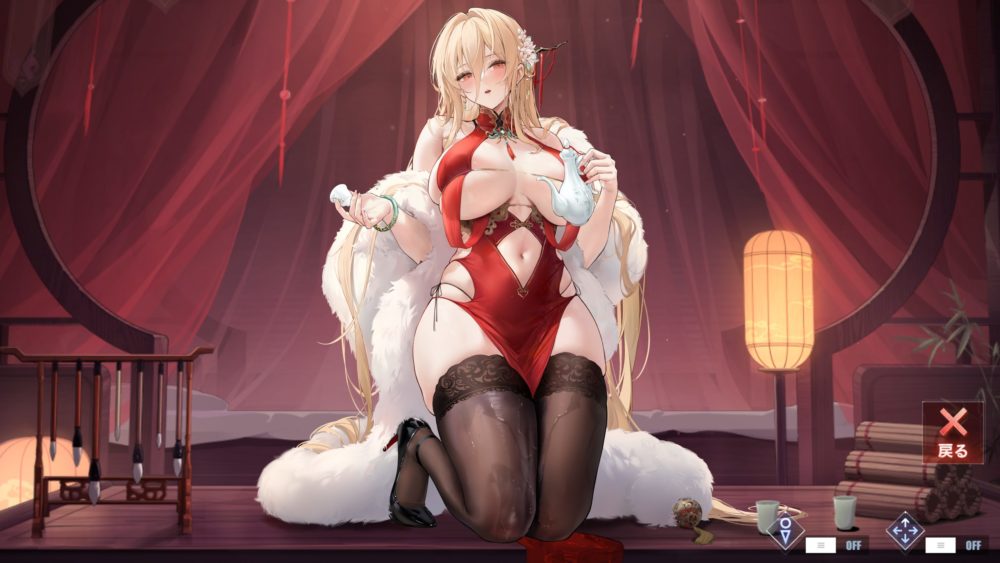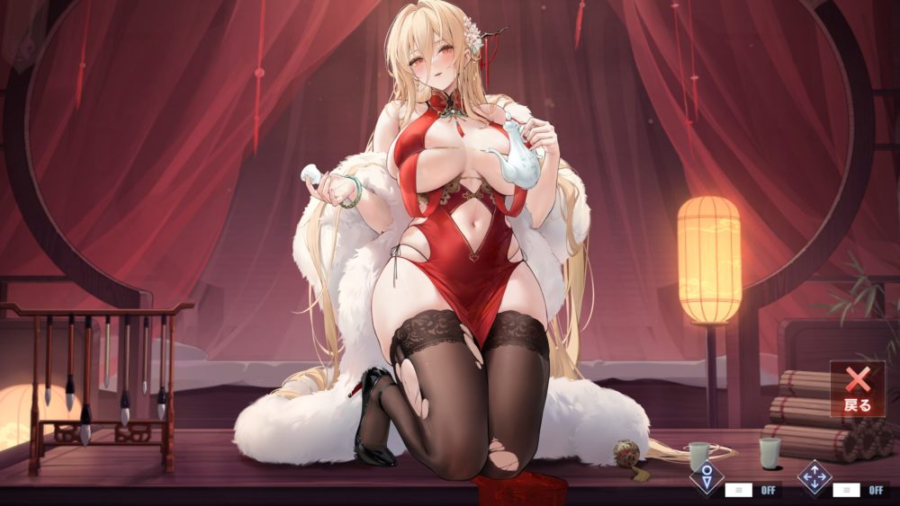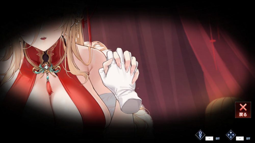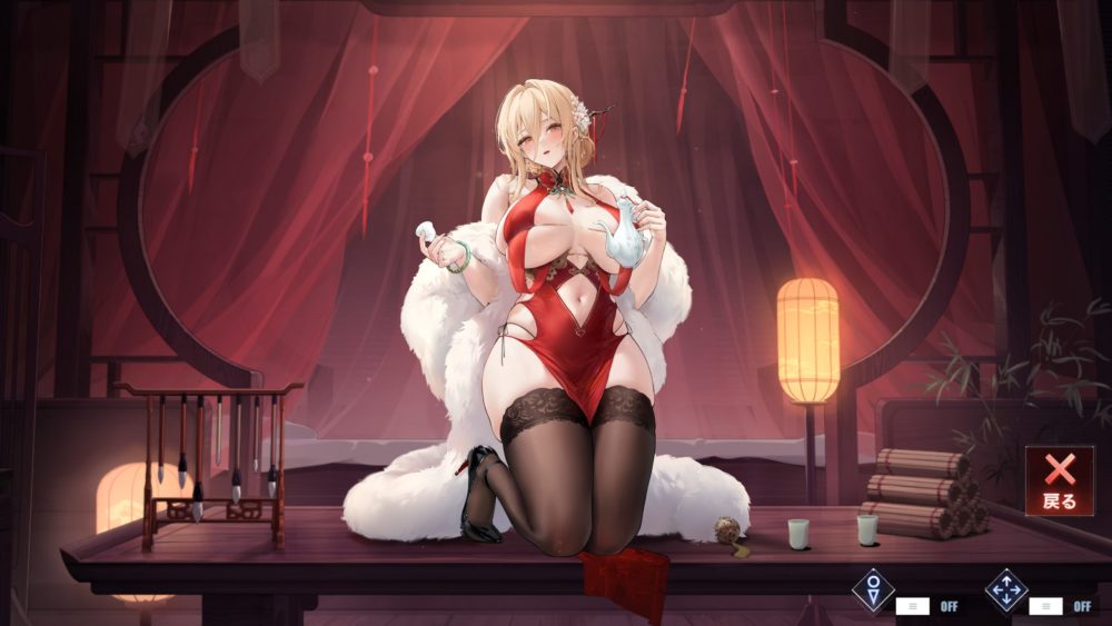 画面右側の行灯をタッチするとカーテンが閉まり、薄暗い中で両手を上げたエッなポーズのインプラカブルが姿を現します。