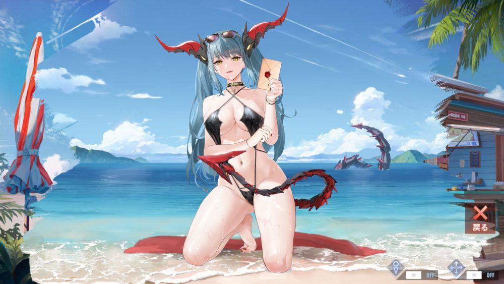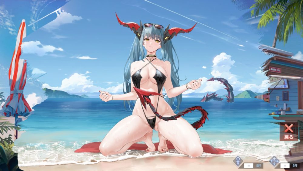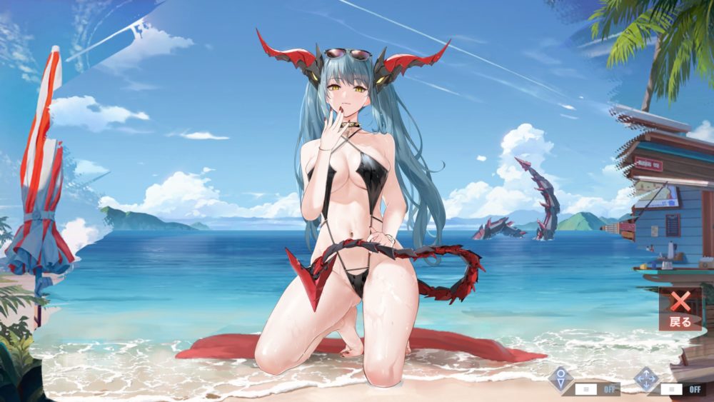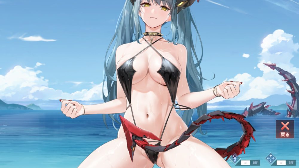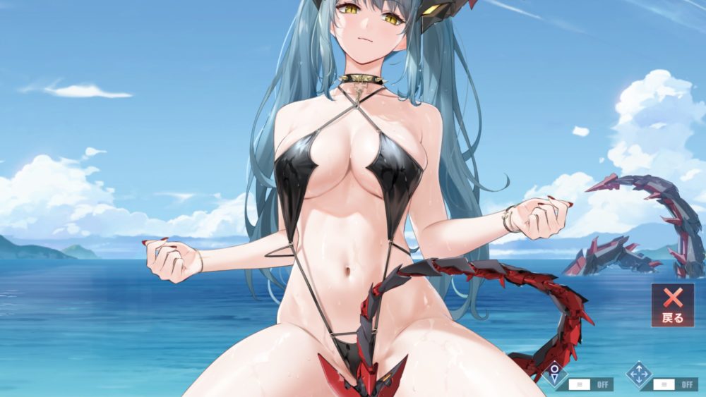 刺激的な水着で股を開いた膝立ちのポーズの組み合わせは半端ないですね!見ていると色々と元気になっちゃいます。特に下の方がっ!…アズレン最高かよ!